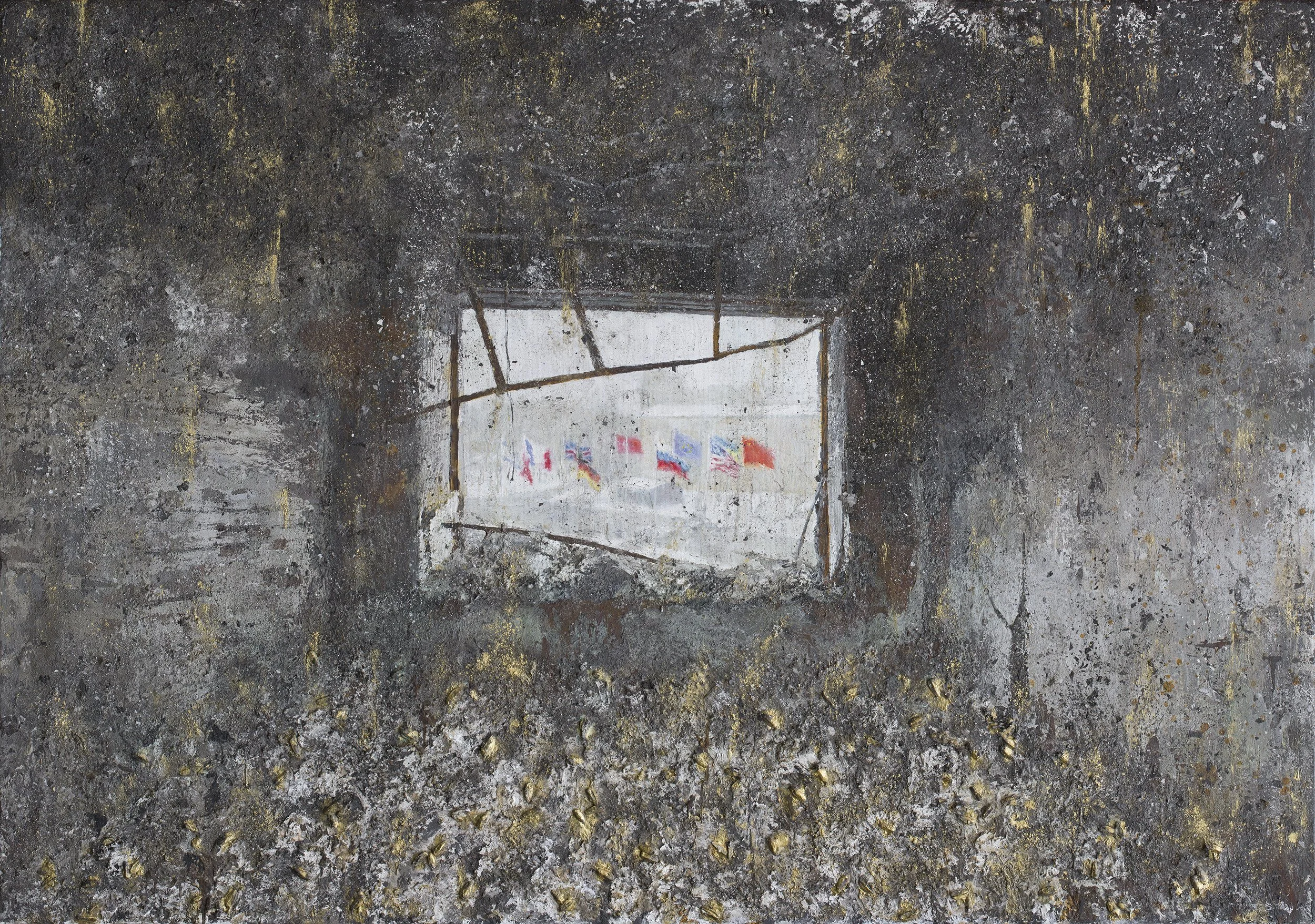 布面繪畫,油彩、丙烯、葵花籽、樹脂、灰燼、水泥、石膏、青銅和鐵